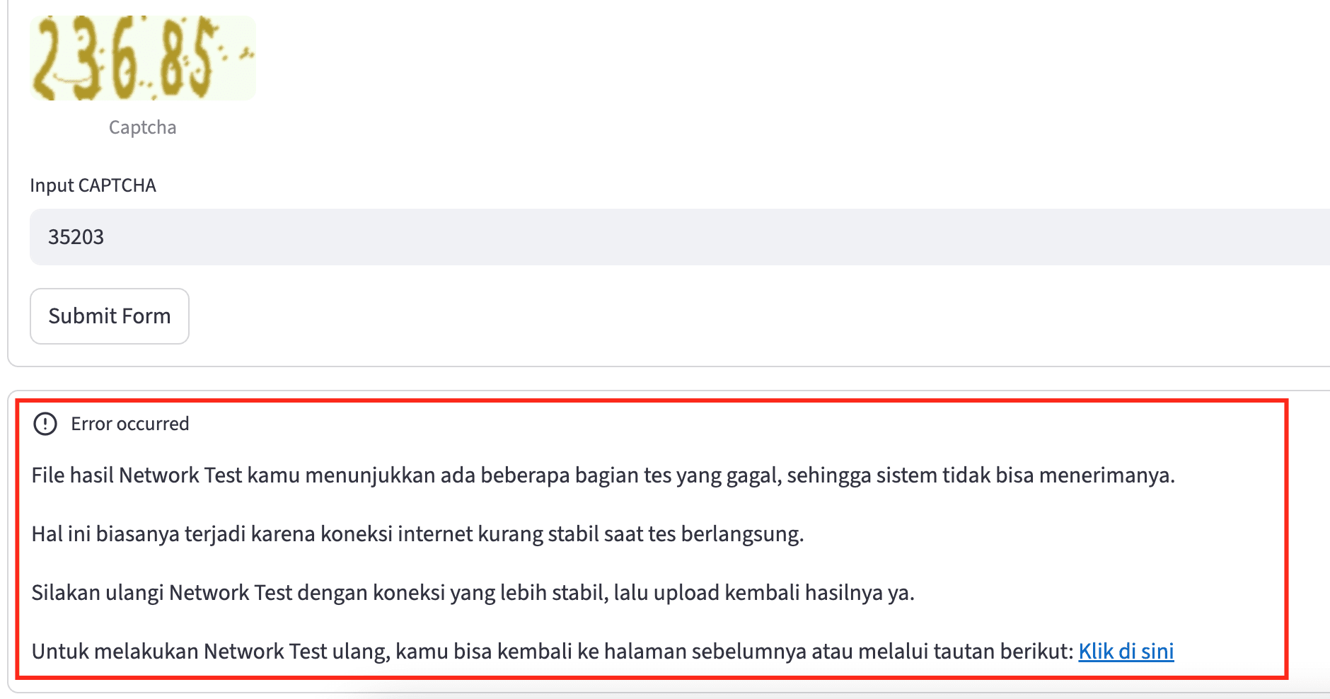 Anda akan diminta mengunggah hasil Network Test yang sudah Anda lakukan sebelumnya.