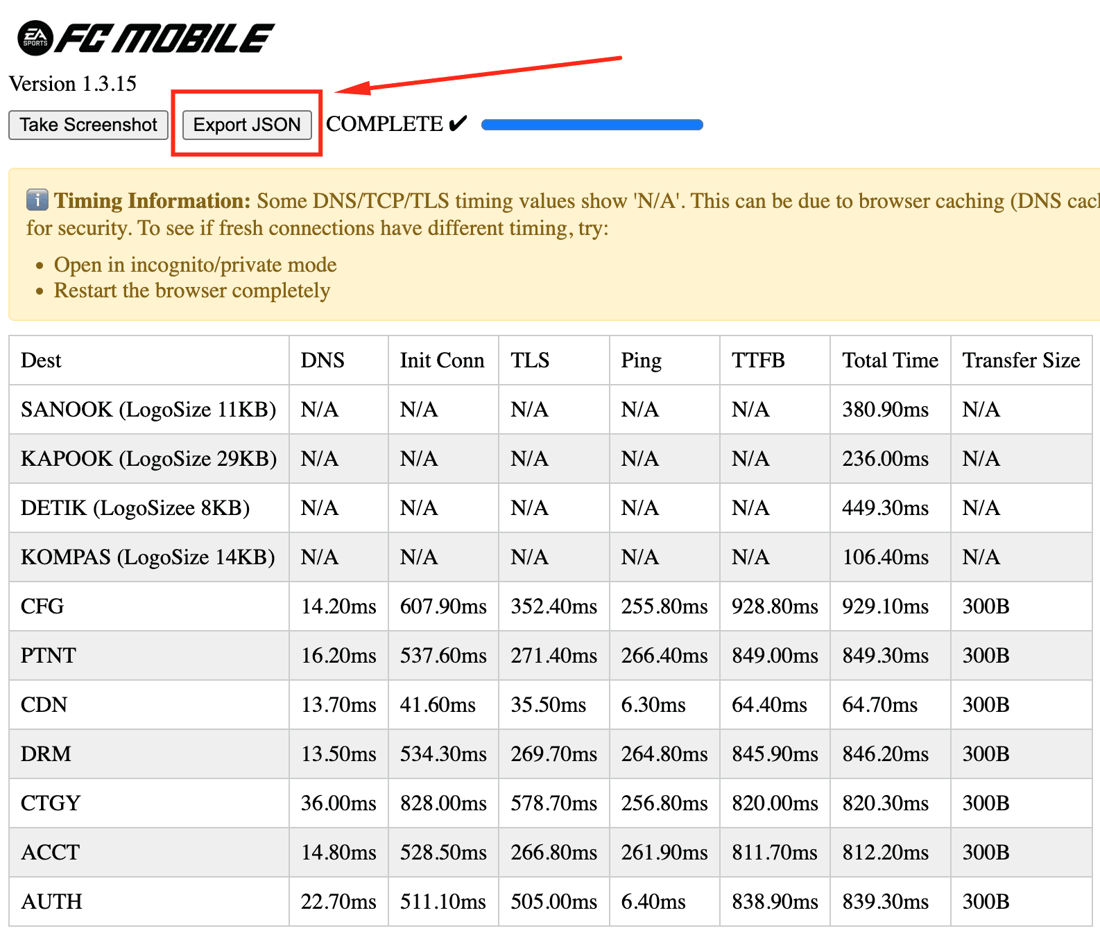 Selepas Ujian Rangkaian selesai, klik butang “Export JSON!” untuk menyimpan fail ke dalam telefon anda.