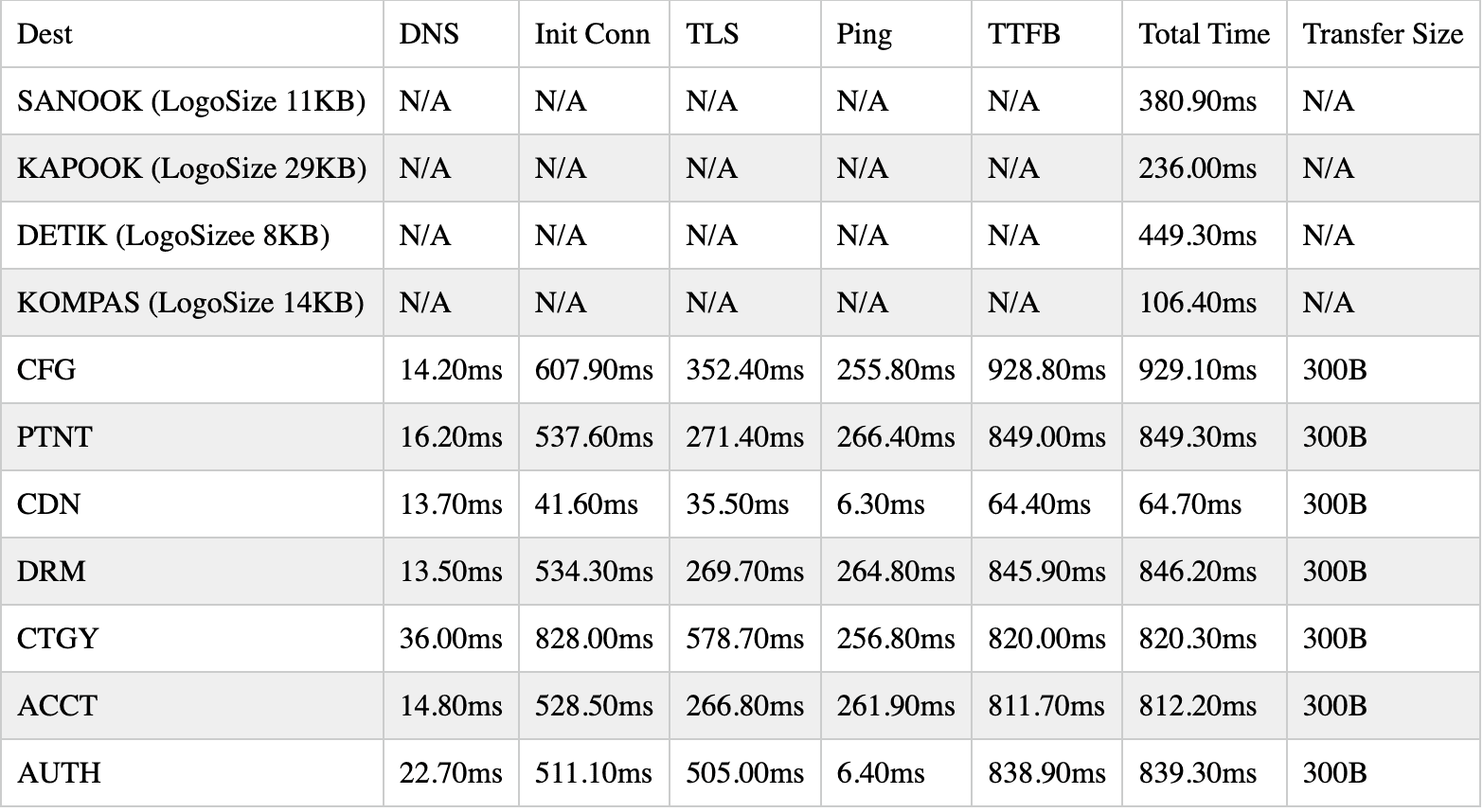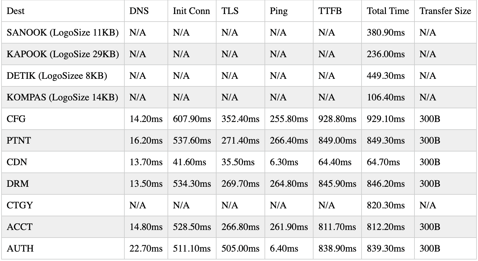 Untuk Dest SANOOK, KAPOOK, DETIK dan KOMPAS, nilai Total Time mesti dipaparkan. Untuk nilai lain dengan nilai N/A, ia tidak penting atau anda boleh mengabaikannya.